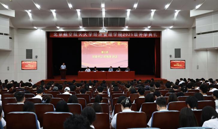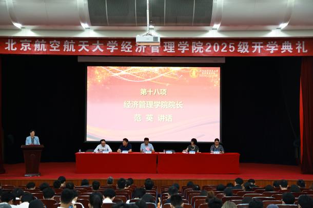 最后,院长范英教授代表学院全体师生向新生表示热烈欢迎。她系统介绍了学院在学科建设、科学研究、人才培养等方面取得的突出成就,并对同学们提出三点期望:锚定国家战略,以“空天情怀”涵养使命担当;深耕交叉创新,以“经管思维”破解行业难题;传承实干作风,以“敏行笃实”锤炼过硬本领。她勉励大家胸怀爱国奉献之志,努力成为堪当民族复兴大任的时代新人。